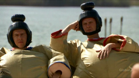 Dwight and Angela plan to sabotage events by having Angela, who is on Andy's team, pretend to mishear everything that Andy says. Michael reveals the next event to be mock sumo wrestling, using the large movement-limiting costumes common to amusement park-style, recreational sumo wrestling. Dwight emerges victorious, and, as planned, Angela pretends not to hear Andy's direction, even when he slips into the lake in his buoyant costume and begins drifting downstream. Away from the others, Karen and Jim phone headquarters, making appointments for the same open interview that Michael was invited to. Oscar intends to break up with his partner, Gil. He adds that he may (with Angela's encouragement) experiment with heterosexual relationships, although it's not clear if he is serious about that part.
