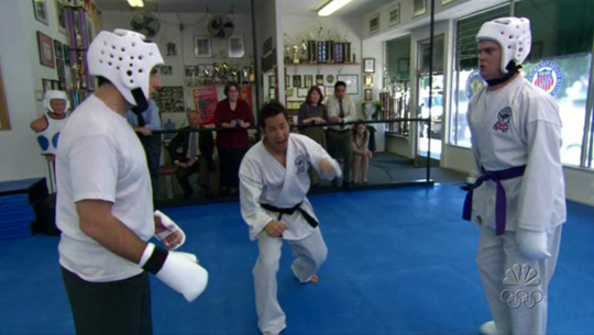 | Dwight's constant bragging about his martial arts abilities leads to a lunch-time match between Michael and Dwight at Dwight's dojo. | ||||