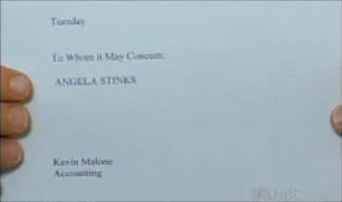 | The accounting team thinks Michael may have stolen the money and wait for him to leave his office. In the meantime, Kevin concludes that Angela is mean. | |||